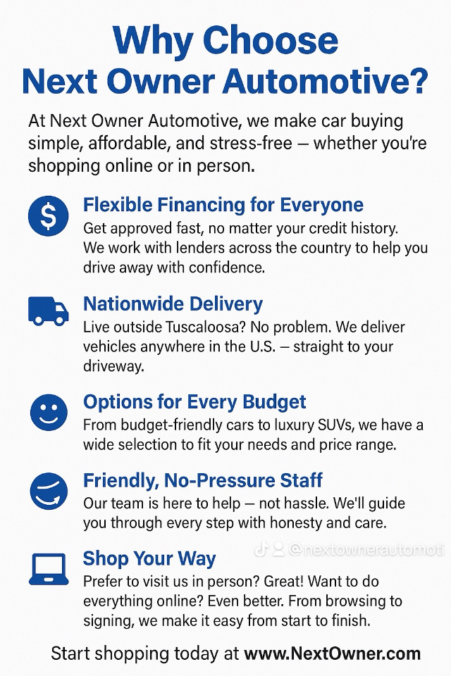 Visit Next Owner Automotive online at www.nextowner.com to see more pictures of this vehicle, set up financing, or contact us via text or call us at 205-710-3600 today to schedule your test drive. We offer free delivery up to 150 miles and delivery with shipping fee up to 500 miles.